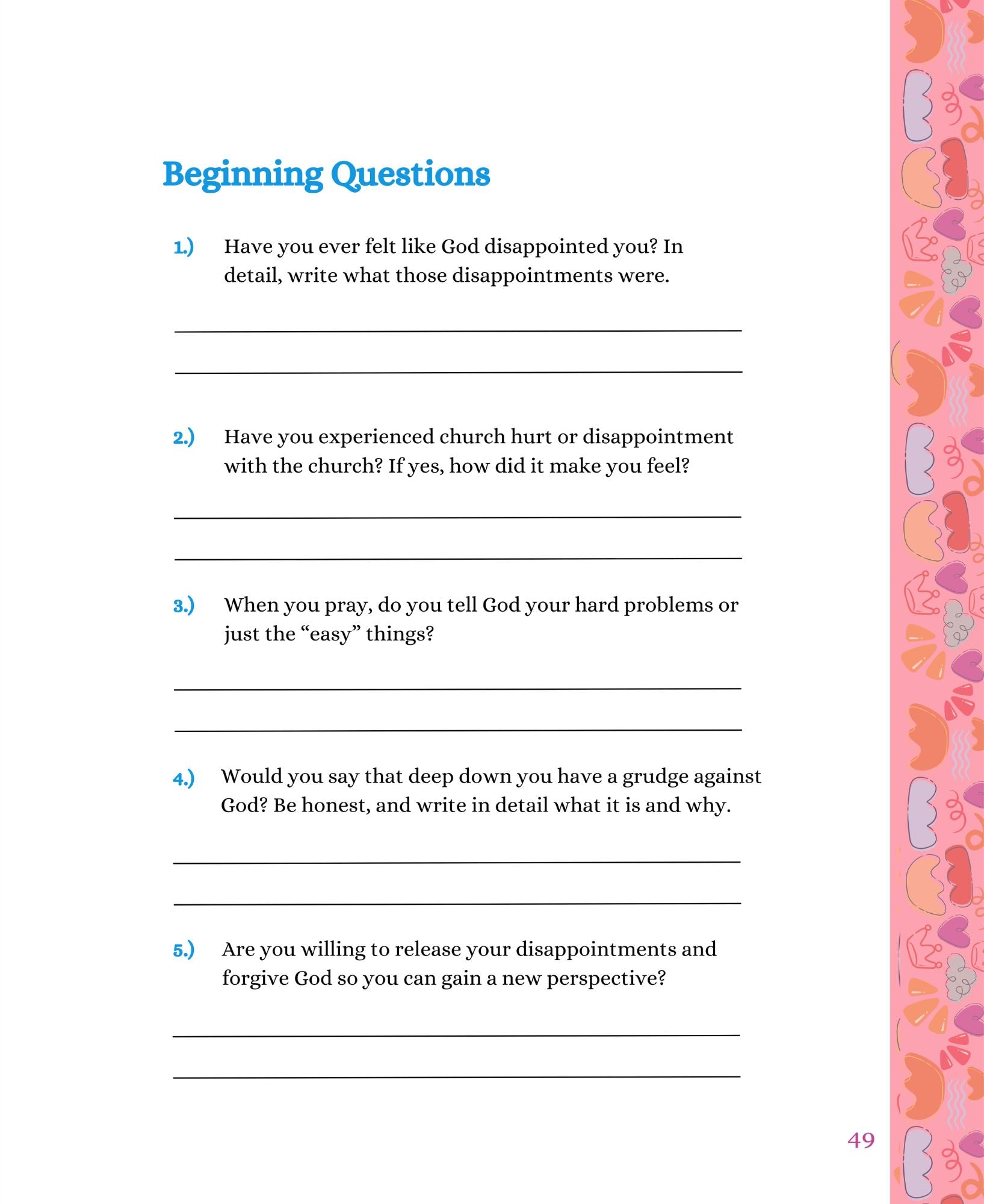 Fun activities—Write down all the hard feelings and learn to release your burdens to God. No more holding back. No more hiding your true feelings. It's time to let them out.
